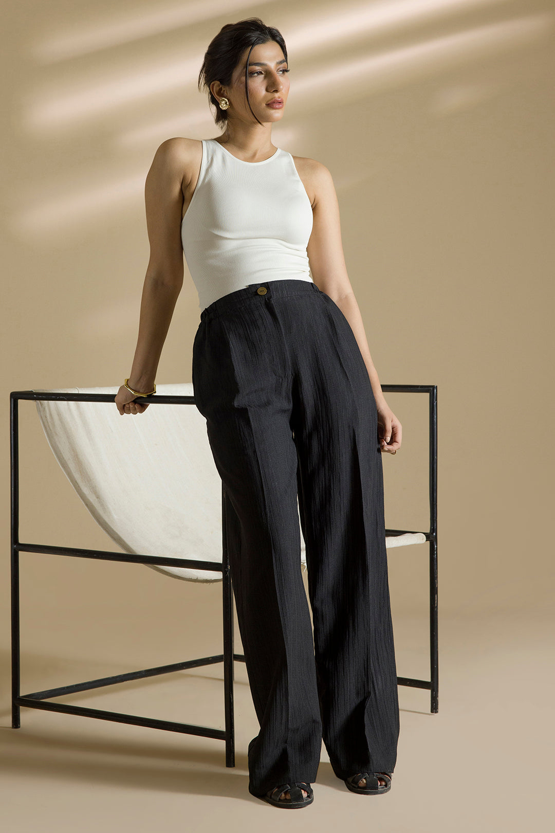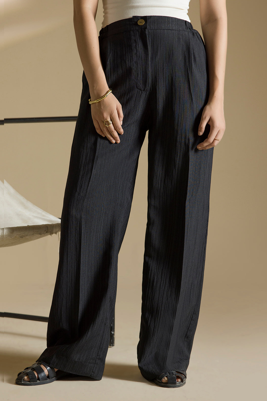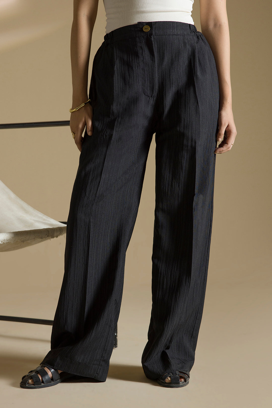 High-waisted Black tailored-fit trousers in textured fabric, featuring wide leg bottom and side pockets for a polished yet easy-to-style look.