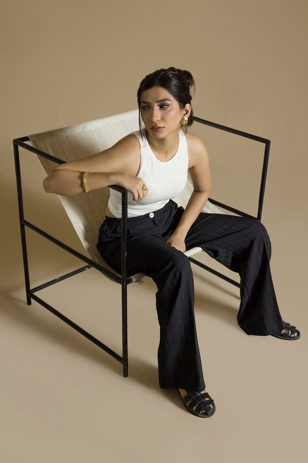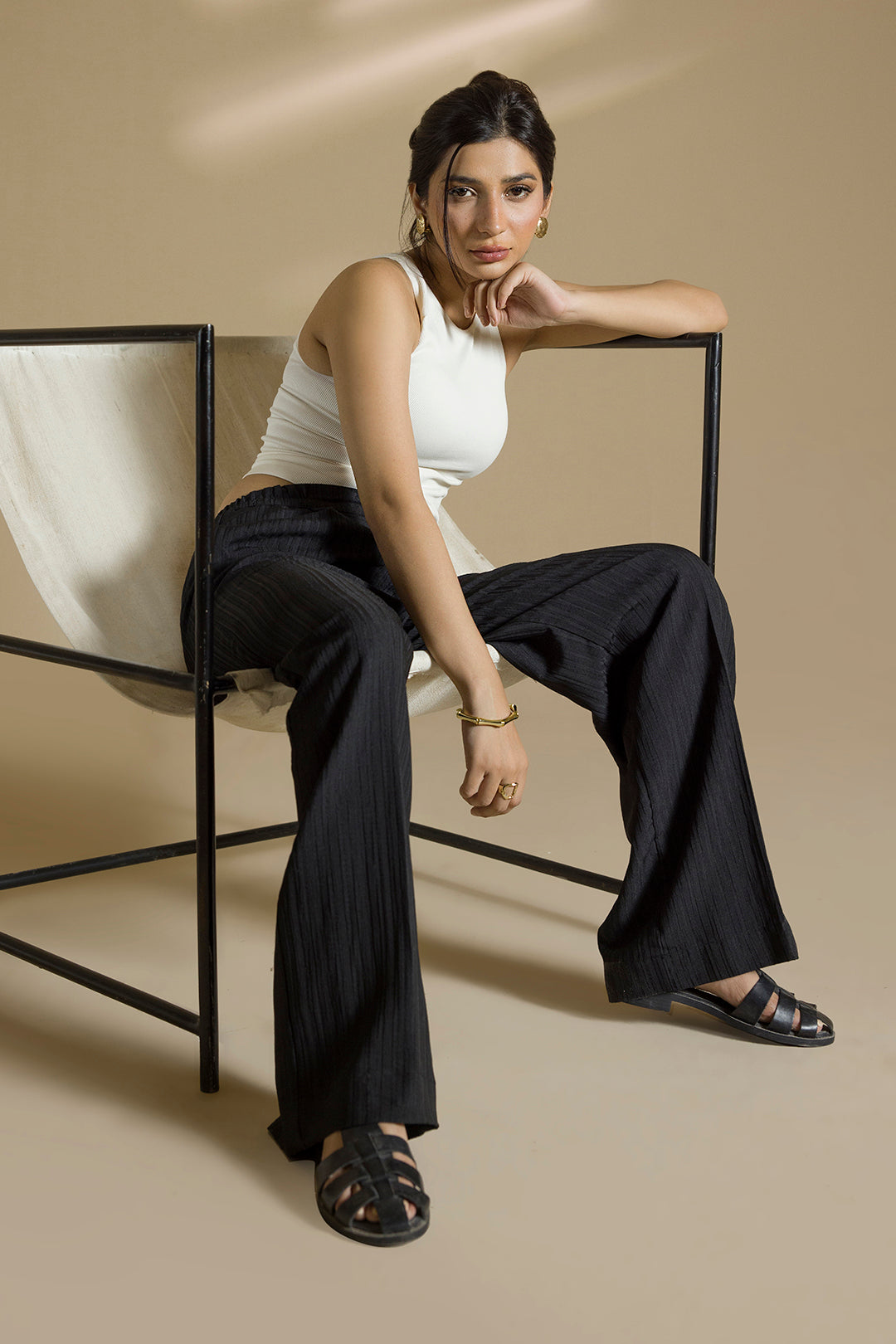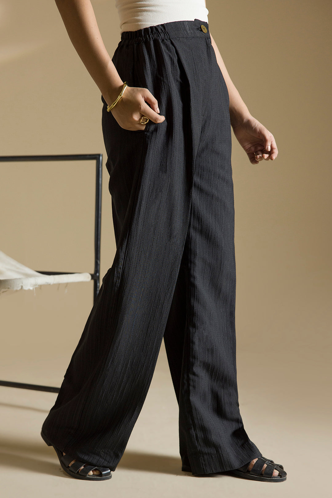 High-waisted Black tailored-fit trousers in textured fabric, featuring wide leg bottom and side pockets for a polished yet easy-to-style look.