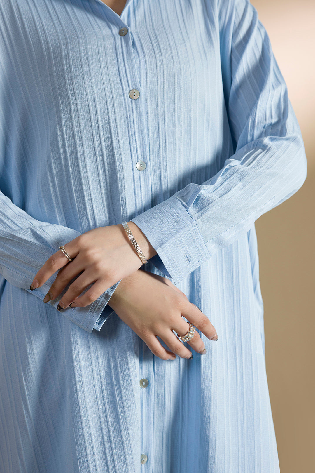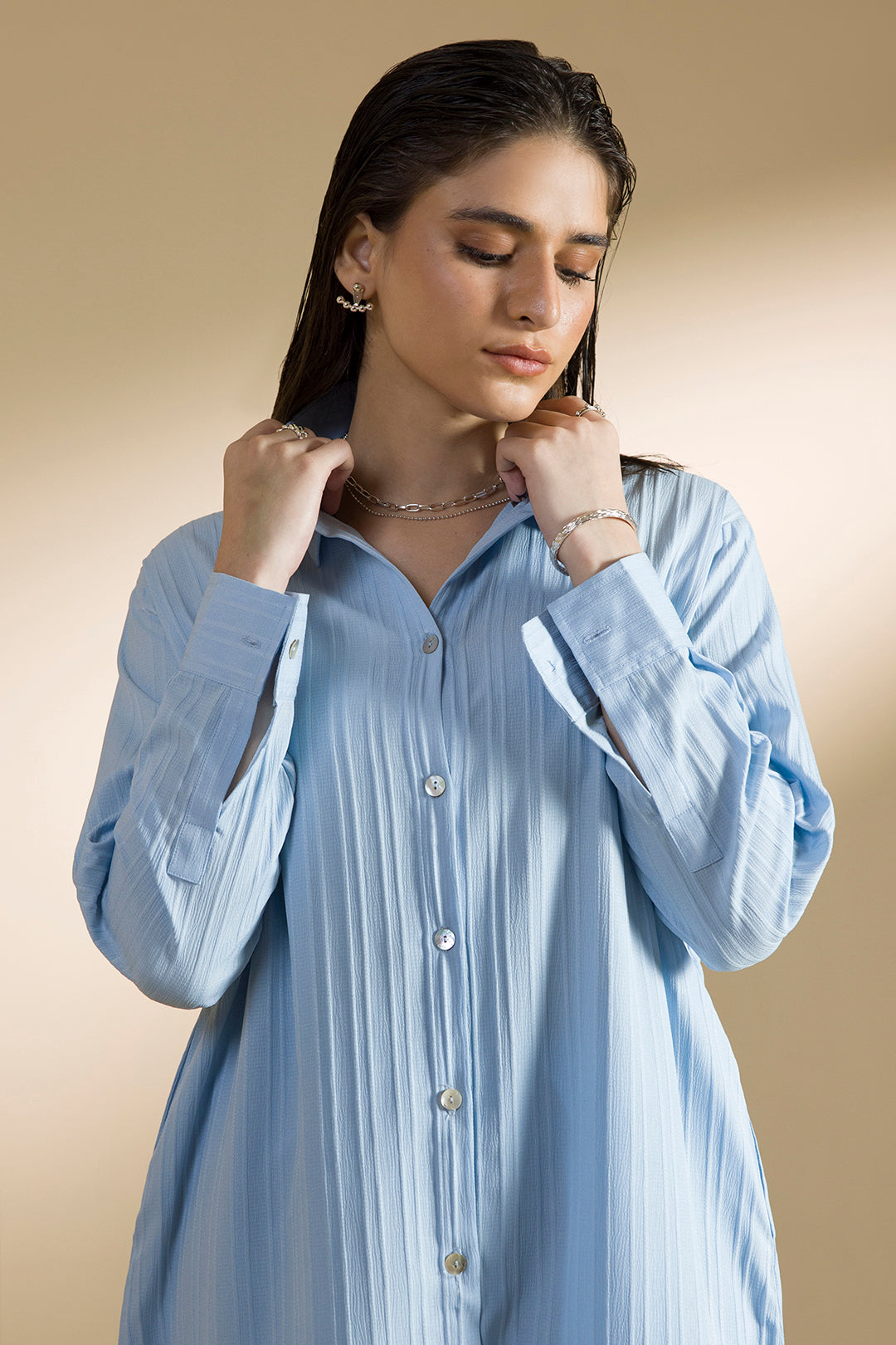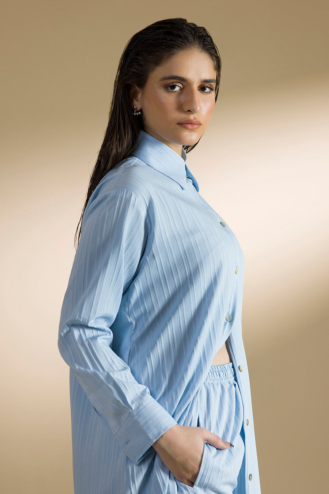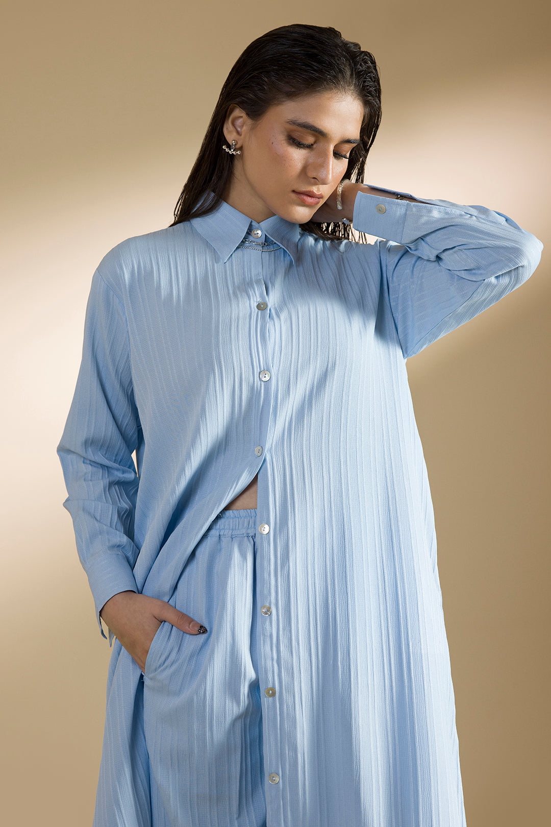Relaxed-fit Sky Blue long co-ord set in textured fabric, featuring a full length button down shirt with side pockets and wide-leg bottoms with functional pockets.Effortlessly versatile: the shirt can be styled fully buttoned, partially open, or worn as a dress, while the wide-leg bottoms work seamlessly as part of the co-ord or as standalone pieces.