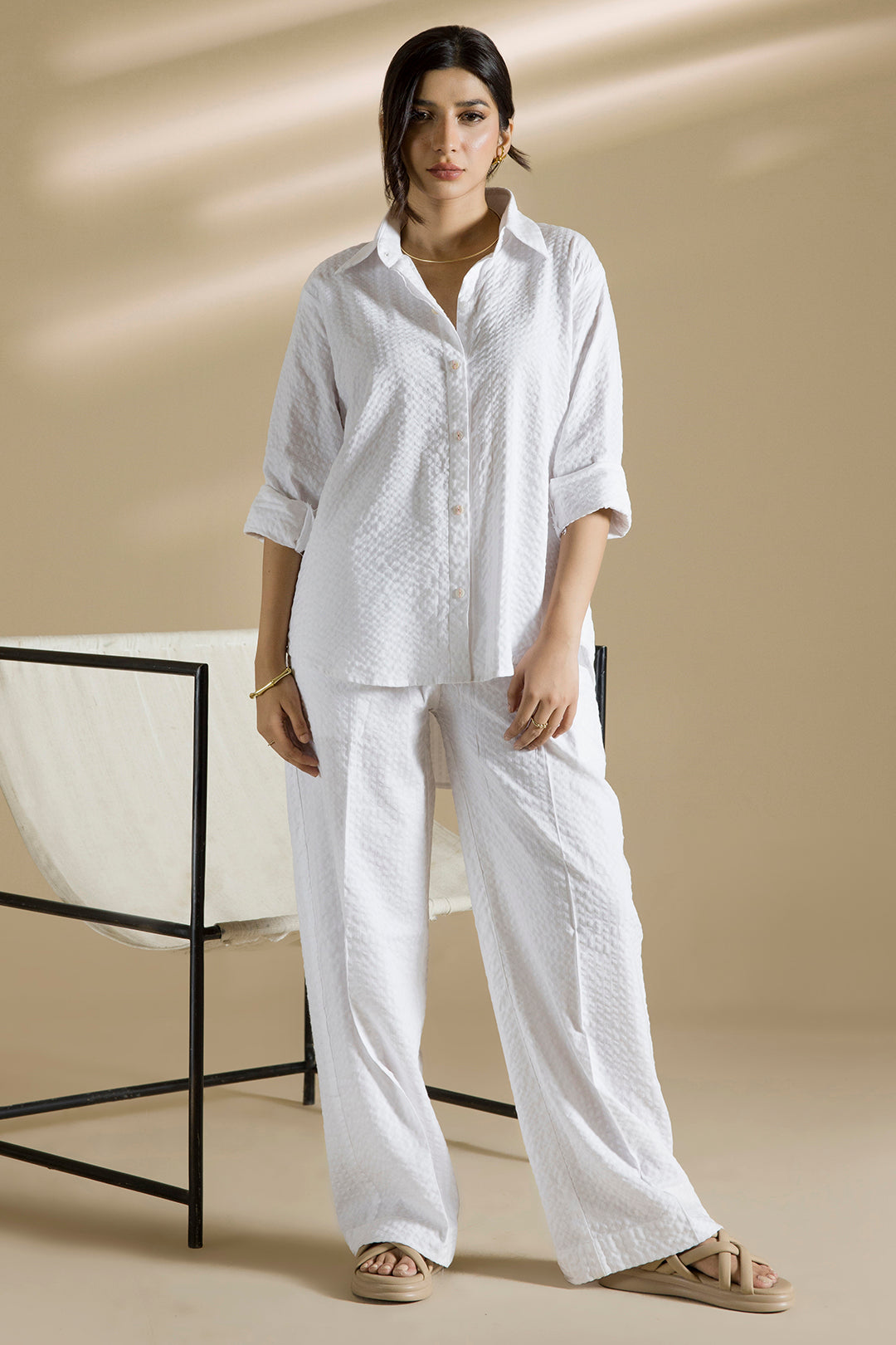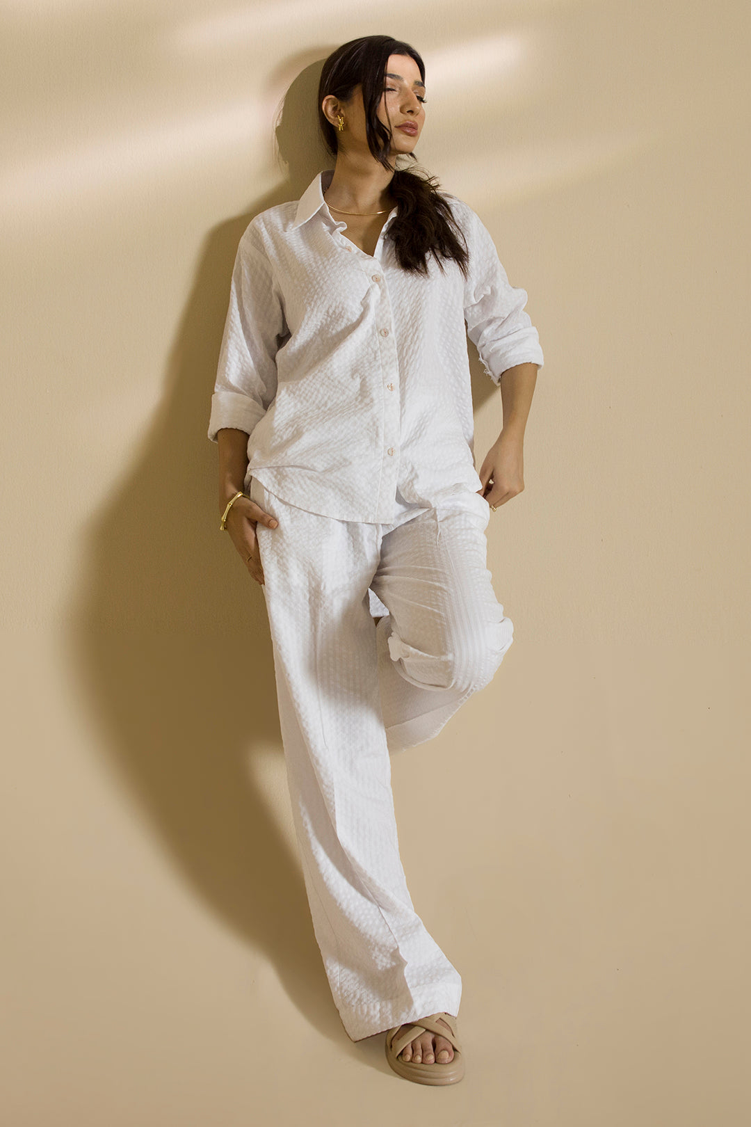 Relaxed-fit white co-ord set in textured seersucker, featuring a high-low shirt with a clean double placket and wide-leg bottoms with functional side pockets. A modern, effortless matching set designed for elevated everyday style.