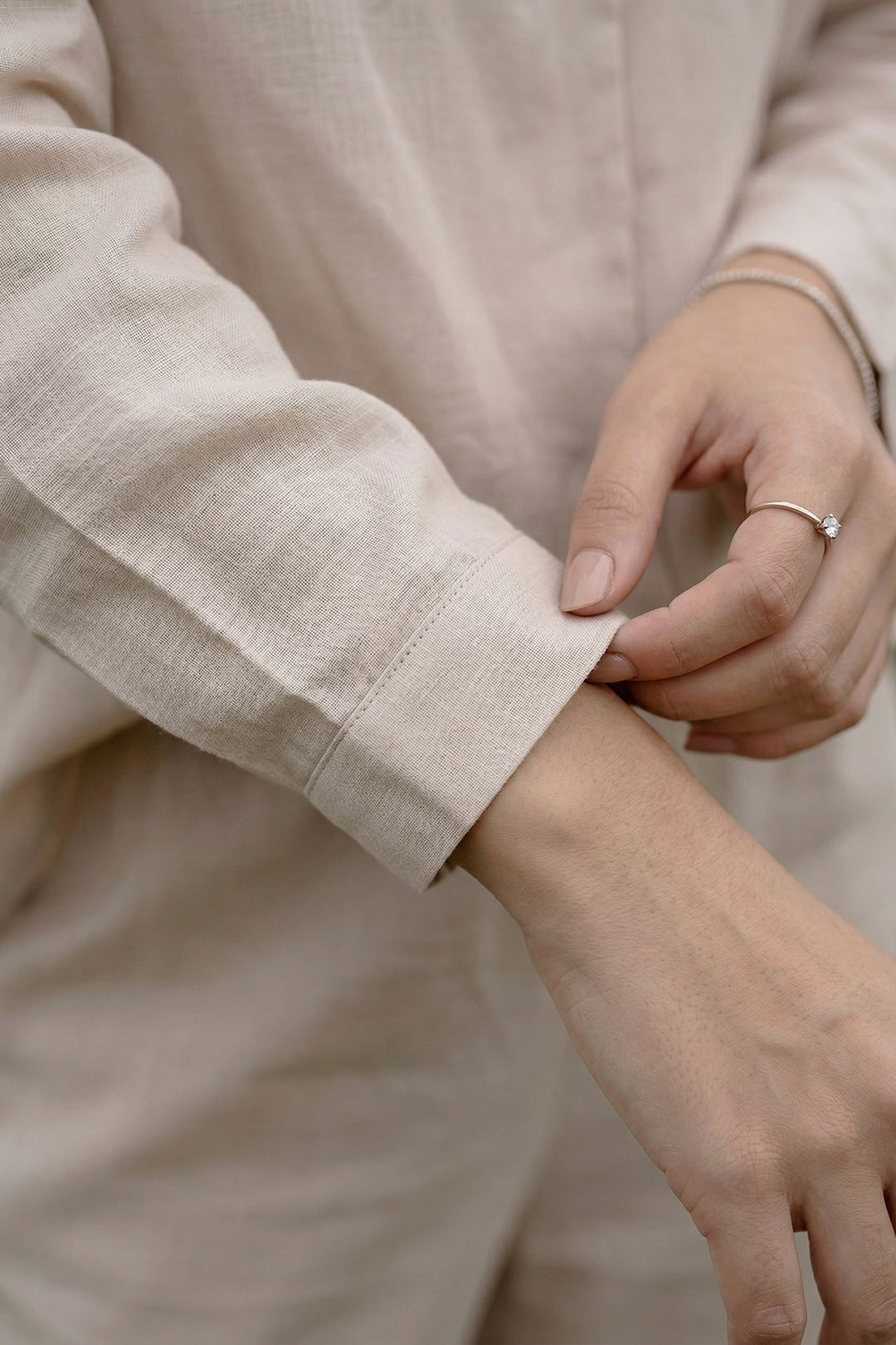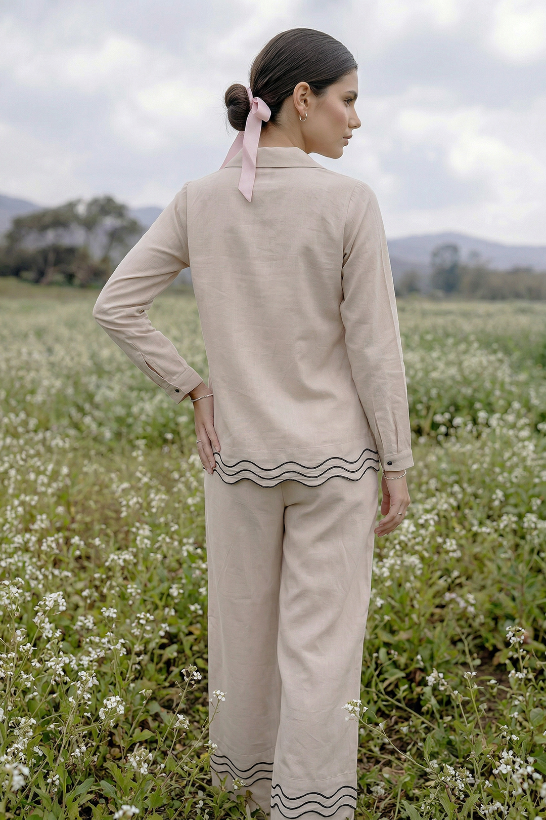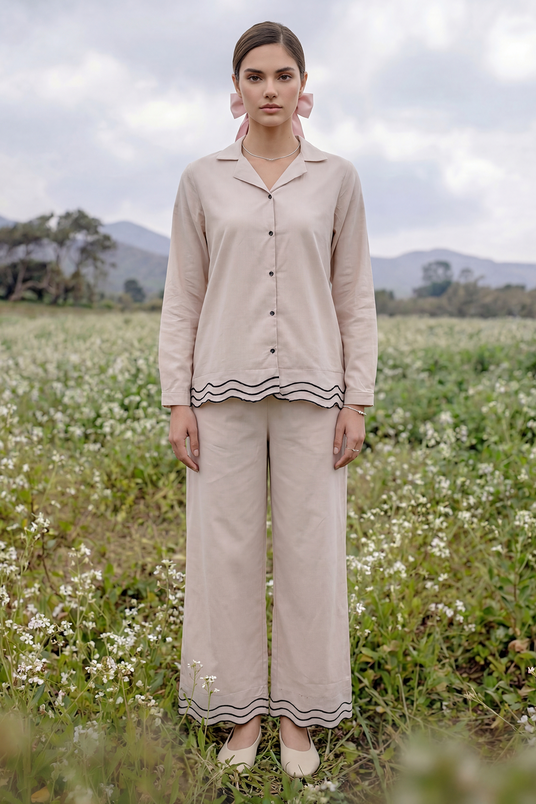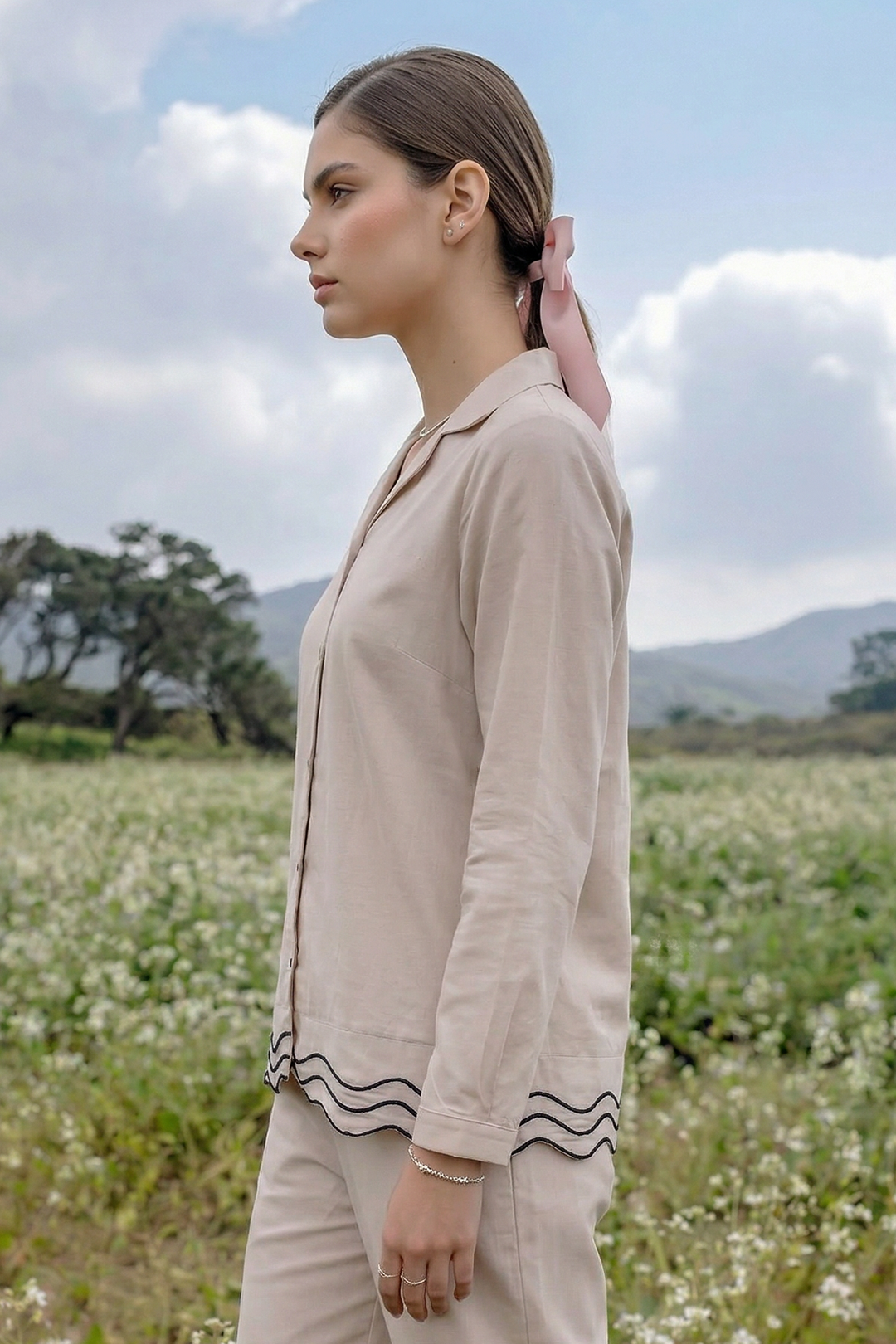 Elevate your wardrobe with this sophisticated women's co-ord set in a serene beige tone. Crafted from premium cross slub fabric, this ensemble features intricate embroidery detailing that adds an elegant touch to your everyday style. The coordinated two-piece design offers versatility and comfort, perfect for casual outings or semi-formal occasions. The textured cross slub material ensures durability while maintaining a refined aesthetic. An ideal choice for those seeking timeless elegance with contemporary flair.