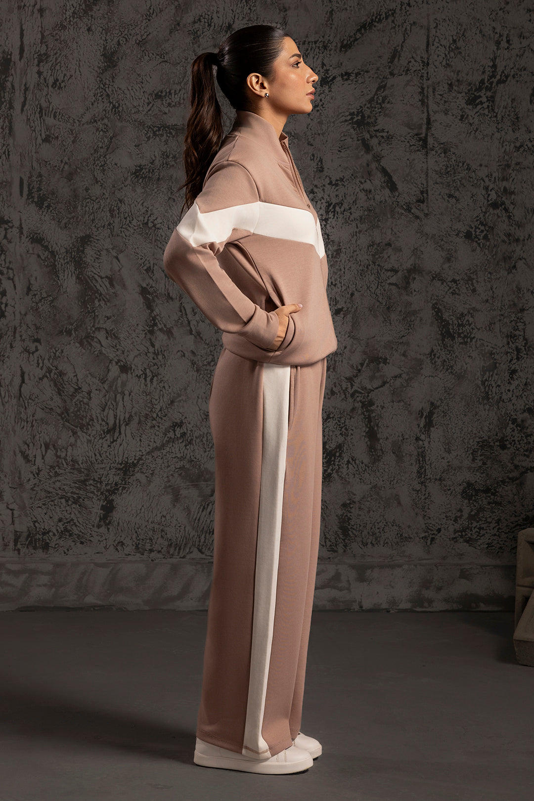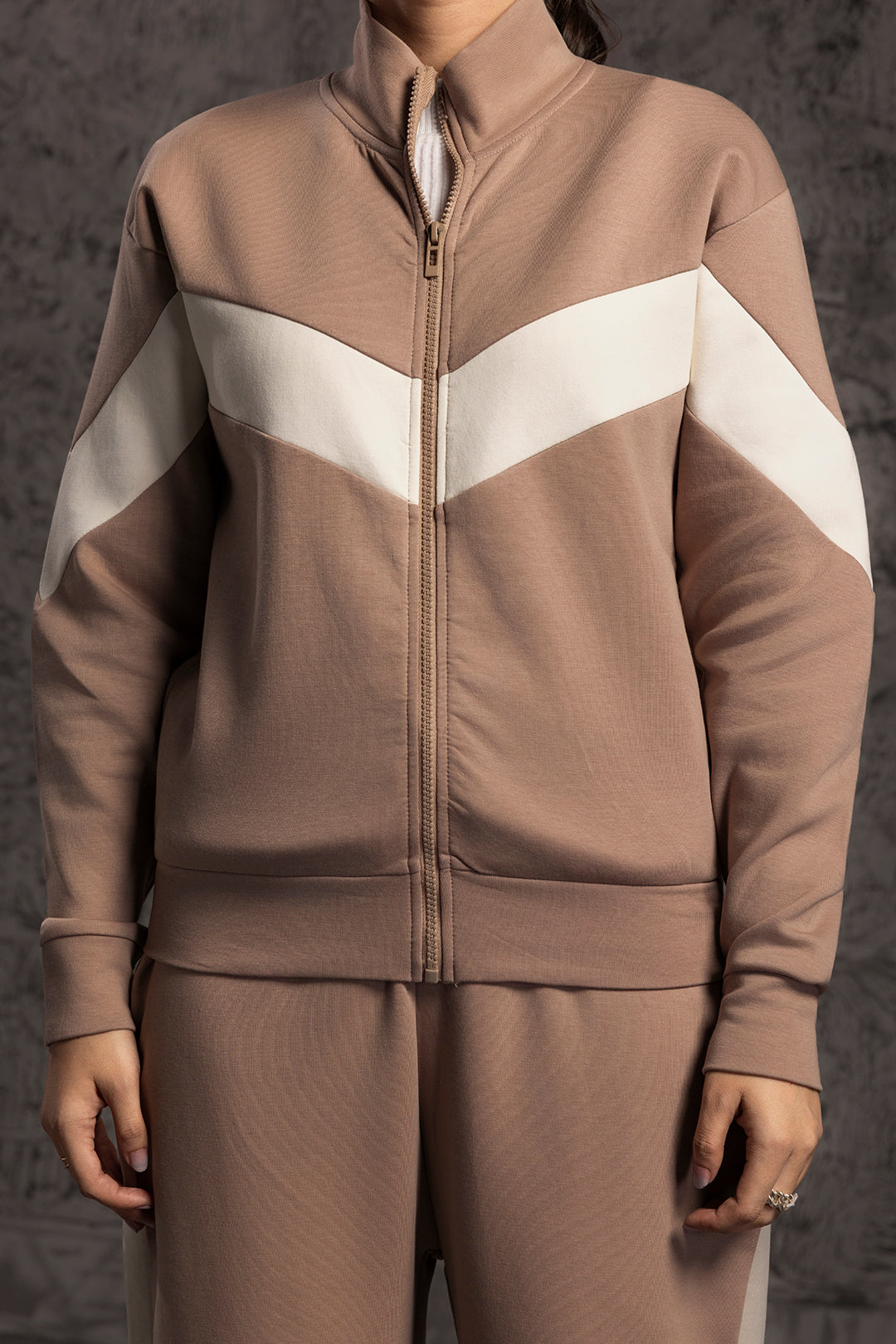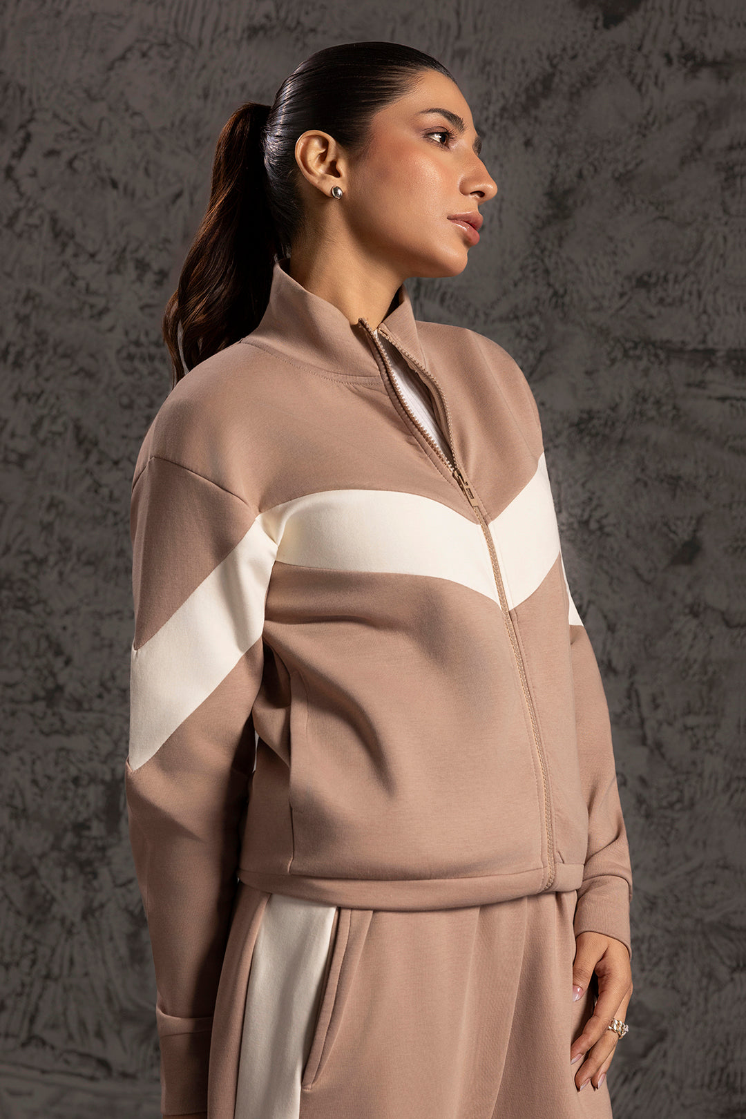 Tailored fit mocha zip-up shirt in premium scuba interlock fabric, featuring off-white cut and sew panels along with functional side pockets and a high neck. structured for an elevated and athleisure look.