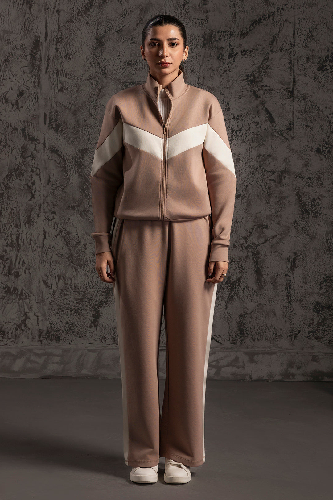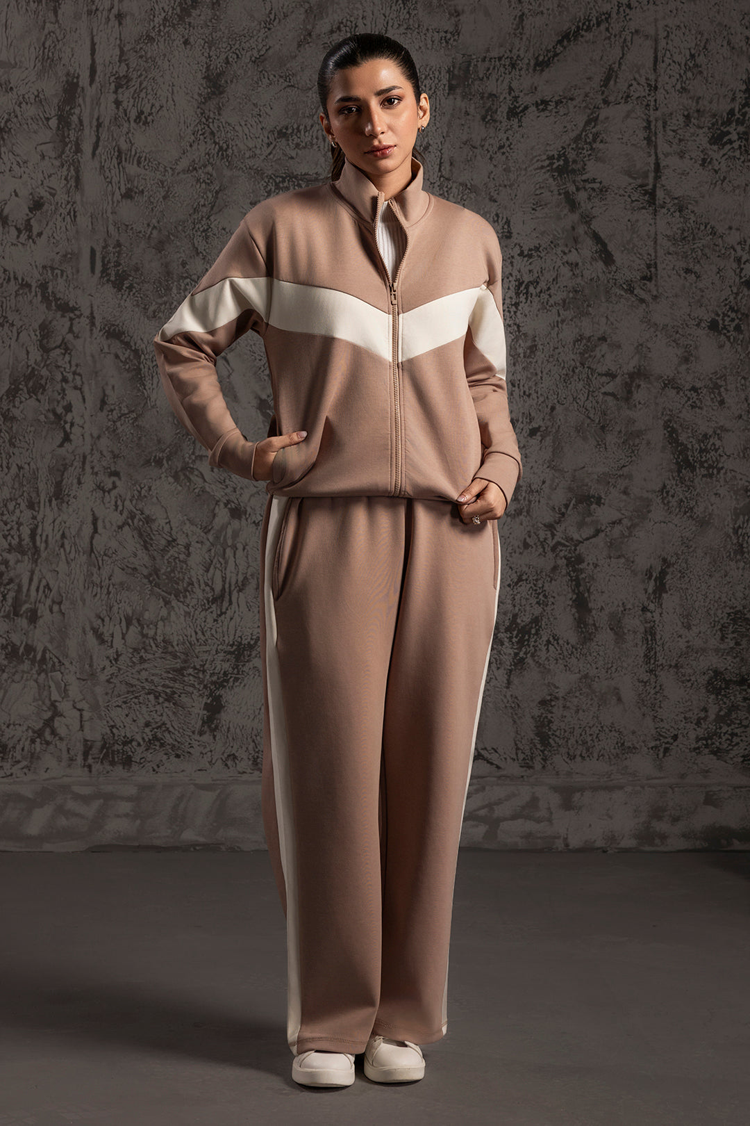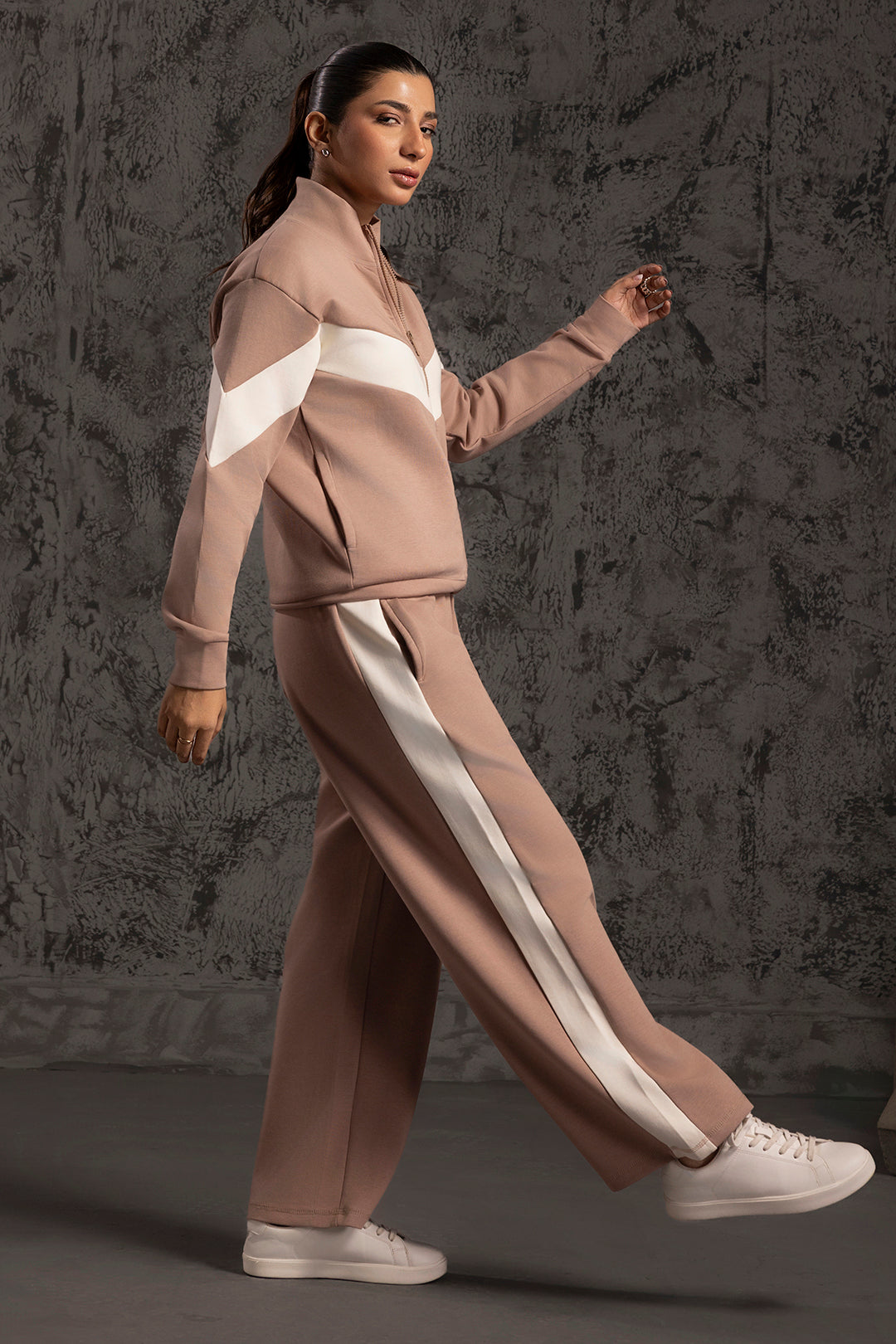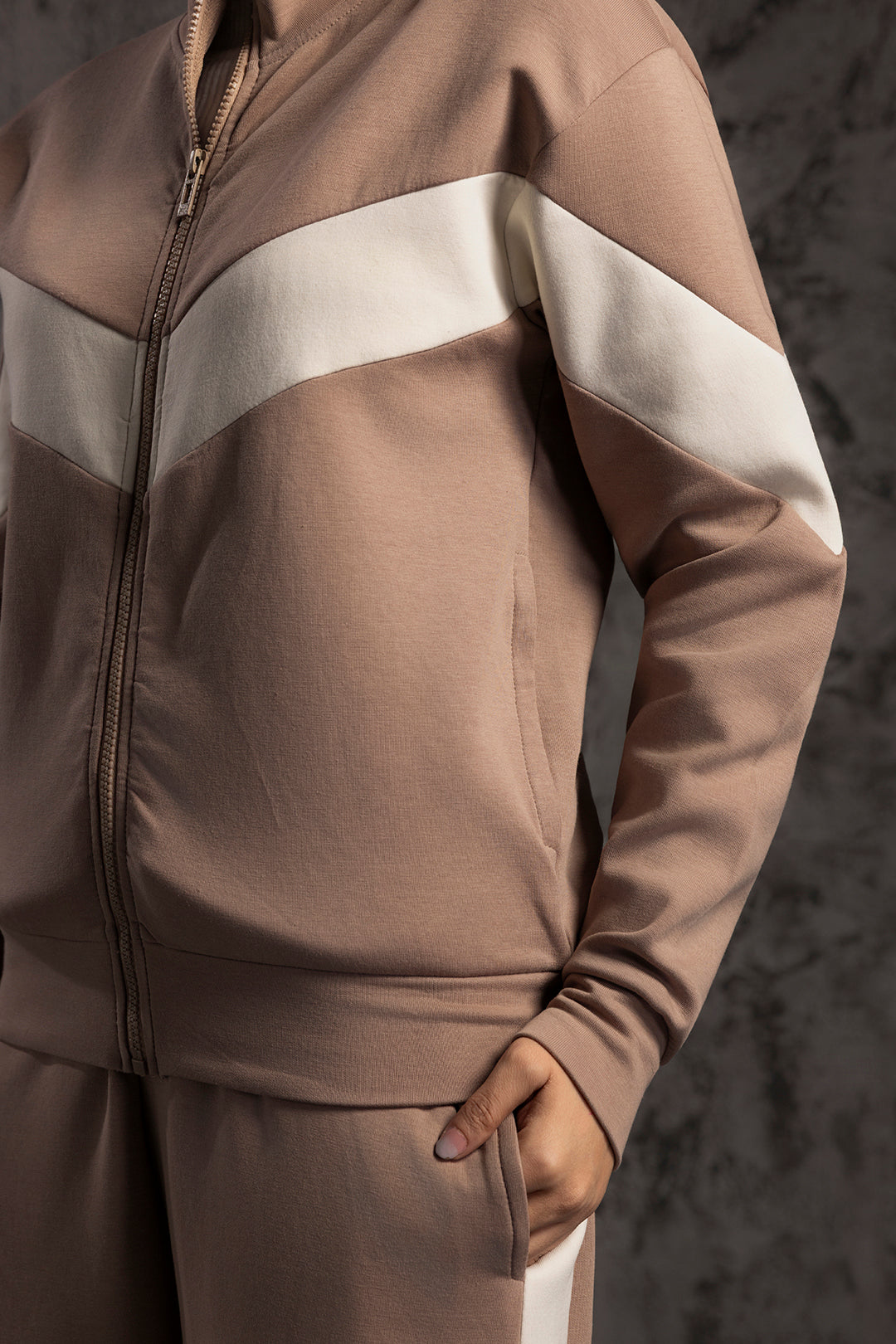 Tailored fit mocha zip-up shirt in premium scuba interlock fabric, featuring off-white cut and sew panels along with functional side pockets and a high neck. structured for an elevated and athleisure look.