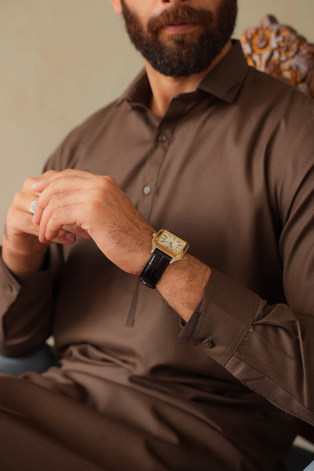 Elevate your traditional wardrobe with this sophisticated Jade Shalwar Kameez, expertly crafted from premium blended fabric for superior comfort and durability. Featuring a refined shirt collar and precisely cut cuffs, this men's eastern wear piece combines timeless elegance with contemporary tailoring. The rich mocha tone adds versatility to your collection, seamlessly transitioning from casual gatherings to formal occasions. Designed for the discerning gentleman who values quality craftsmanship and authentic style.
