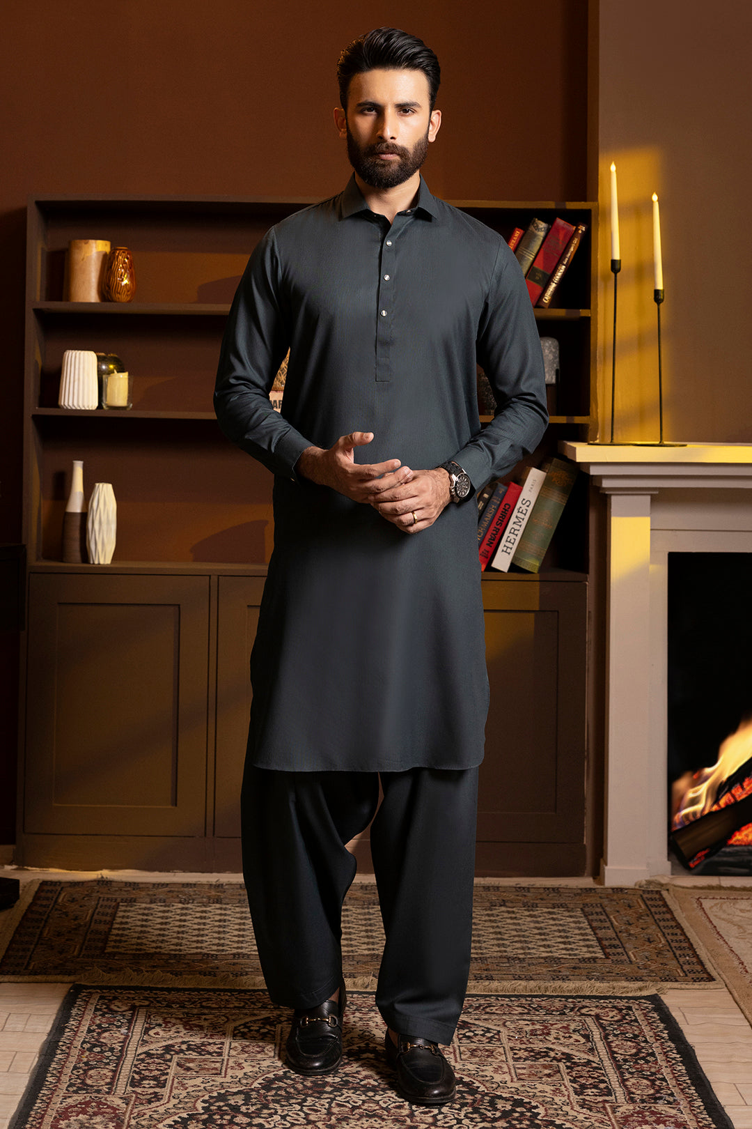 The Jade Shalwar Kameez in dark green offers a refined Eastern wear option for men, crafted from a comfortable blended fabric that balances durability with ease of movement. Its classic design complements both formal and casual occasions, providing a versatile addition to your wardrobe with a subtle, sophisticated color.