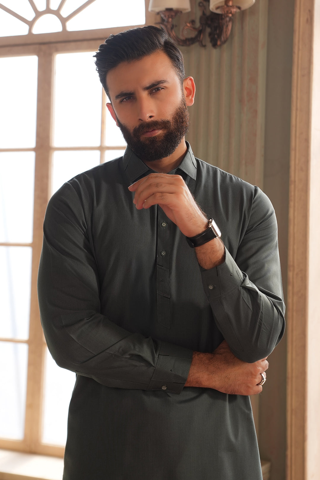 Elevate your traditional wardrobe with this sophisticated Jade Shalwar Kameez, expertly crafted from premium blended fabric for superior comfort and durability. The refined band collar and straight cuffs deliver a polished, contemporary silhouette while honoring classic Eastern wear aesthetics. The rich dark green hue offers versatility for both formal occasions and everyday elegance. Designed for the discerning gentleman, this piece seamlessly blends timeless tradition with modern tailoring, making it an essential addition to any collection.