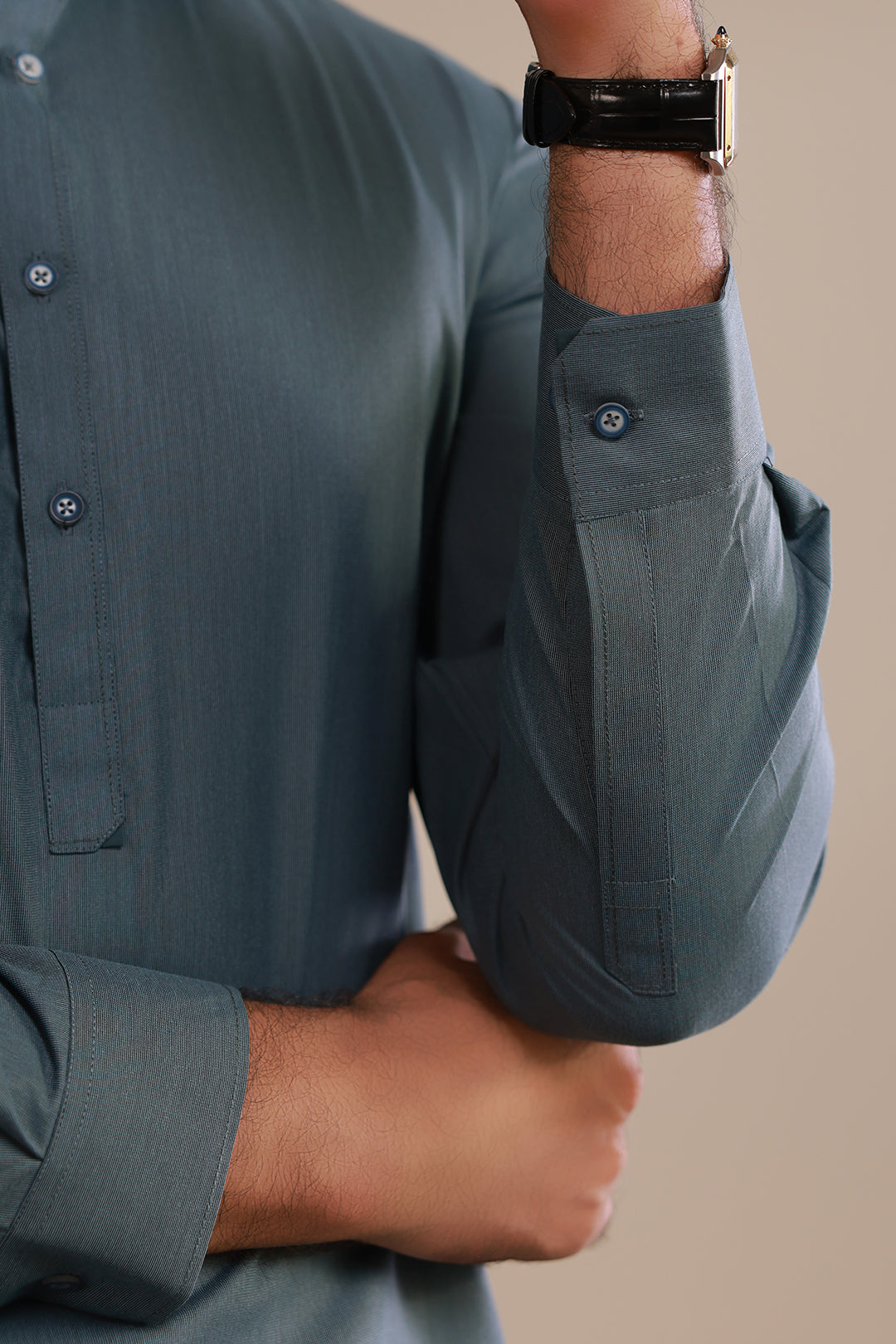 Elevate your traditional wardrobe with this sophisticated Jade Shalwar Kameez, expertly crafted from premium blended fabric for superior comfort and durability. Featuring a refined shirt collar and straight cuffs, this piece combines classic Eastern elegance with contemporary tailoring. The striking turquoise hue adds a distinctive touch to your collection, making it ideal for both formal occasions and everyday wear. Designed for the discerning gentleman who values quality craftsmanship and timeless style.