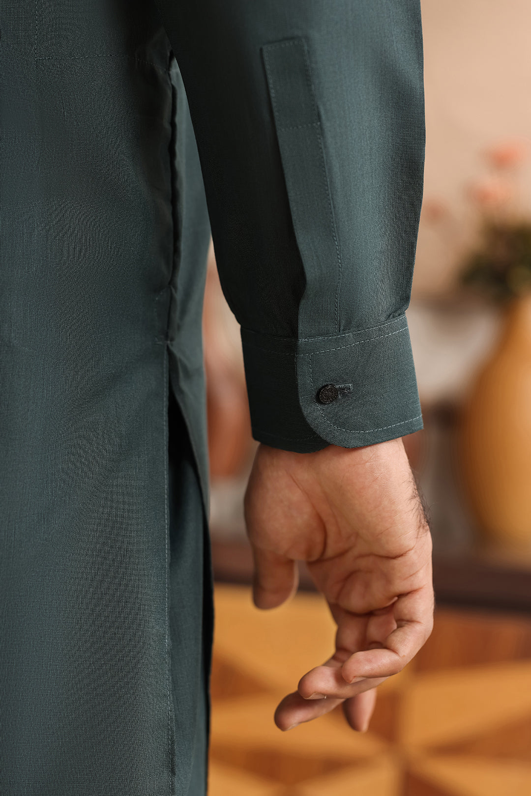 Elevate your traditional wardrobe with this sophisticated Jade Shalwar Kameez. Crafted from a comfortable blended fabric, this men's eastern wear piece features a classic shirt collar and refined cut cuffs. The rich dark green hue adds timeless elegance to any occasion. Perfect for formal gatherings, celebrations, or everyday wear, this shalwar kameez combines authentic style with modern comfort. A versatile essential for the contemporary gentleman.