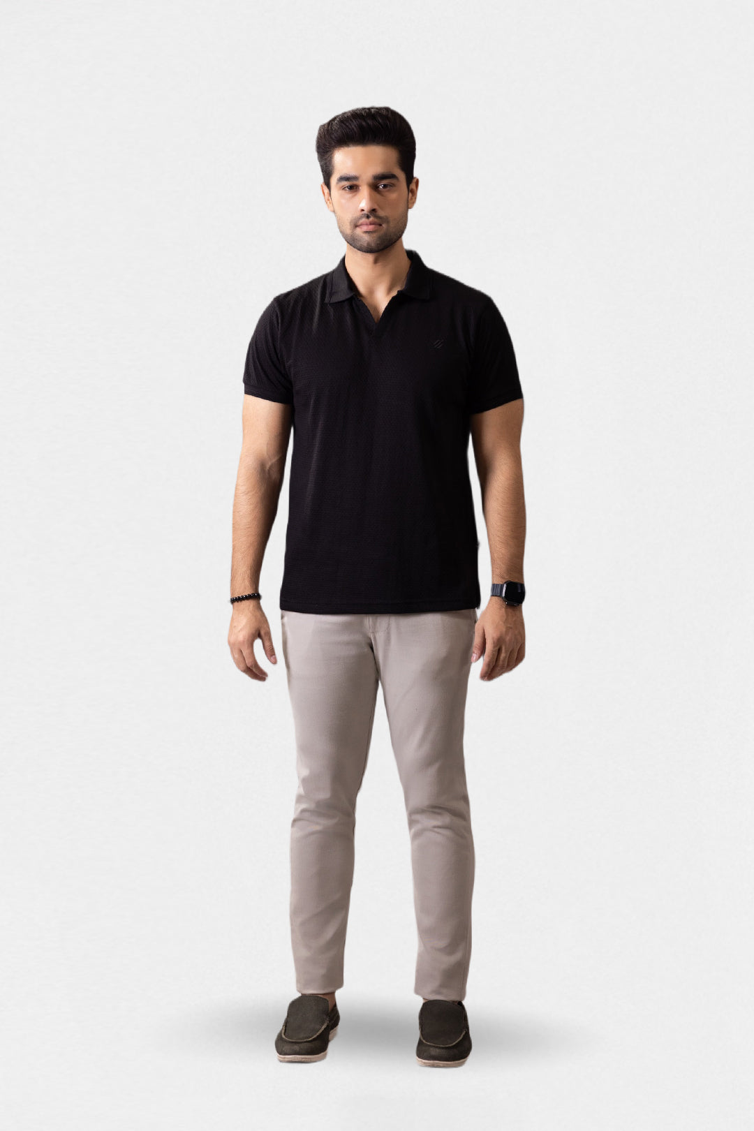 Men Johny Collar with Popcorn Knitted Fabric Polo In Black Color