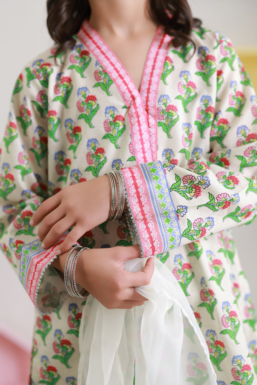 Girls Essential Pret Cambric Kurta Dupatta Trouser 3 Piece In Cream Color