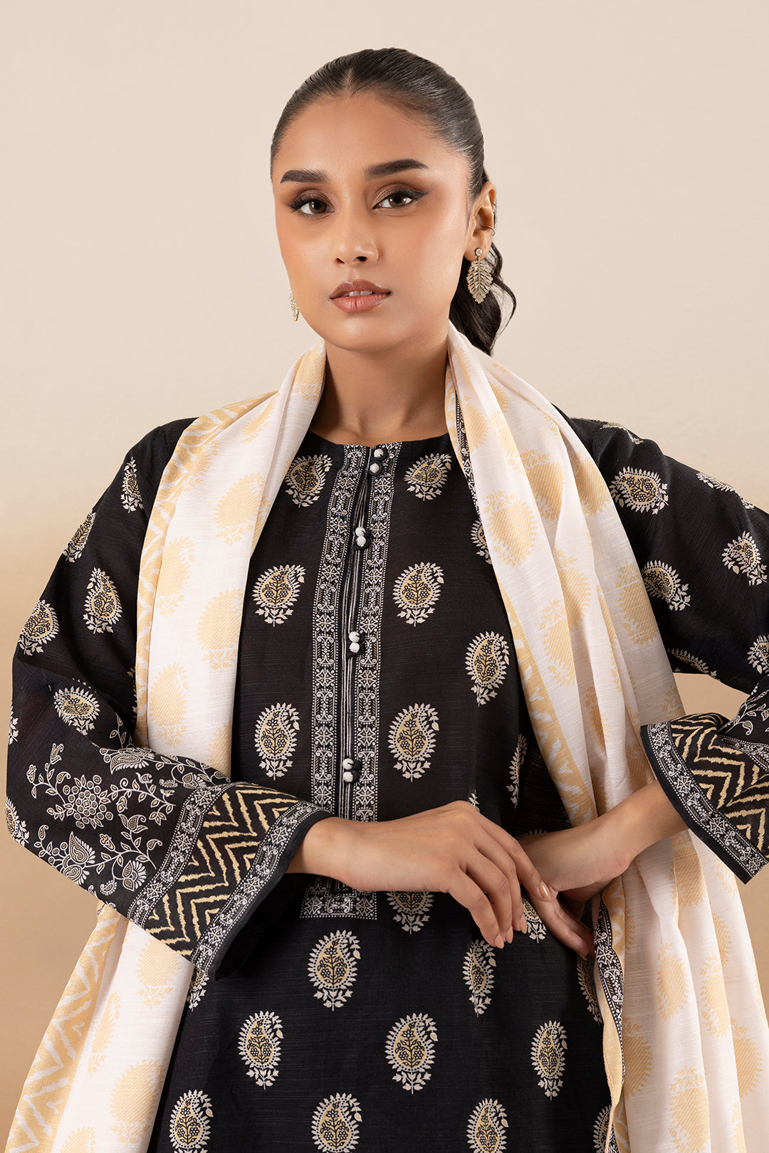 Elevate your everyday wardrobe with this sophisticated three-piece ensemble featuring a printed kurta, coordinating dupatta, and tailored trouser. Crafted from premium khaddar fabric, known for its durability and breathability, this pret collection piece delivers comfort without compromising on style. The classic black palette ensures versatility, seamlessly transitioning from casual gatherings to semi-formal occasions. Perfect for the modern woman seeking timeless elegance with minimal effort. A wardrobe essential that combines traditional aesthetics with contemporary practicality.