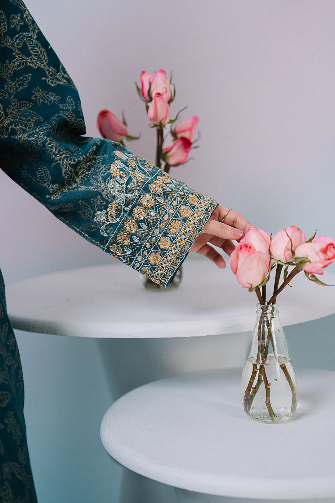 Elevate your wardrobe with this stunning embroidered kurta dupatta trouser set crafted from premium jacquard fabric. Designed for the modern woman, this ready-to-wear ensemble features intricate embroidery detailing in a sophisticated teal hue. The luxurious jacquard material offers a refined texture and graceful drape, perfect for both casual gatherings and special occasions. This three-piece set combines traditional elegance with contemporary style, making it an essential addition to your ethnic collection.