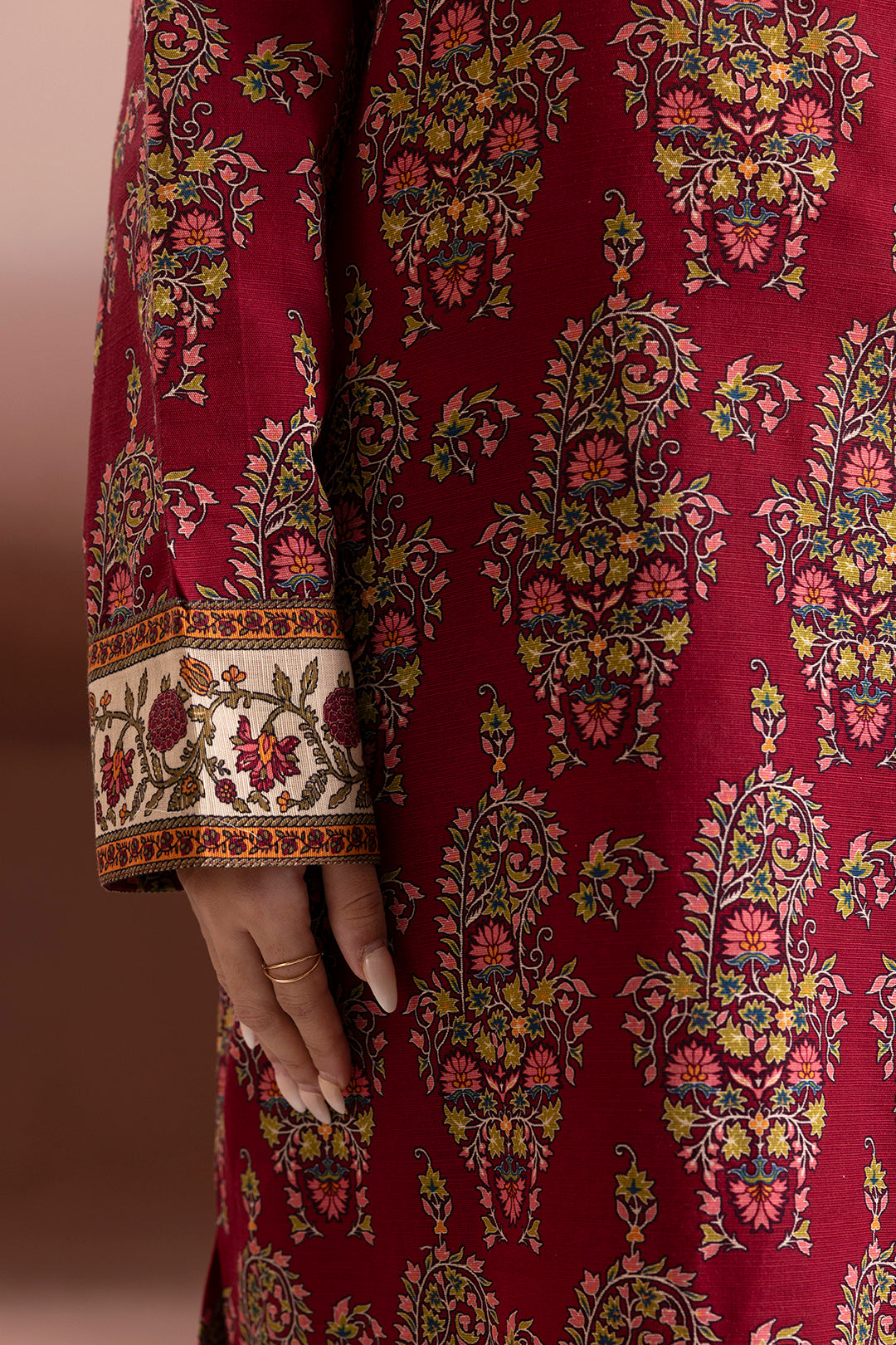 This elegant three-piece set features a maroon printed kurta, paired with a matching dupatta and trouser, crafted from premium Khaddar fabric. Designed for women seeking both comfort and style, the breathable material ensures durability and a refined look suitable for everyday wear or casual occasions. The rich color and intricate prints add a timeless appeal, making this pret ensemble a versatile addition to your wardrobe.