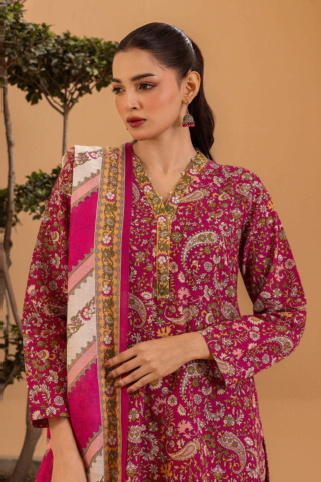 Elevate your wardrobe with this striking hot pink printed kurta dupatta trouser ensemble, expertly crafted from premium khaddar fabric. Designed for the modern woman, this ready-to-wear three-piece set combines traditional elegance with contemporary style. The khaddar material offers exceptional durability and breathability, ensuring comfort throughout the day while maintaining its refined appearance. Perfect for casual gatherings, festive occasions, or everyday wear, this versatile ensemble showcases intricate printed detailing that adds visual interest without compromising sophistication. The coordinated dupatta completes the look with effortless grace, making this an essential addition to any Pakistani woman's collection.