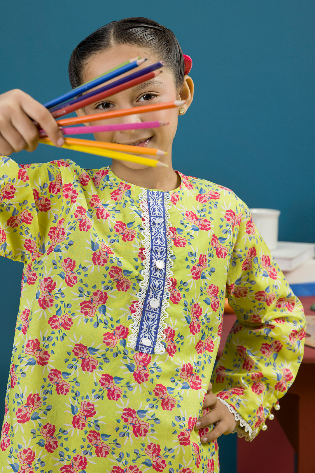 Girls Essential Pret Cambric Kurta Trouser 2 Piece In Yellow Color
