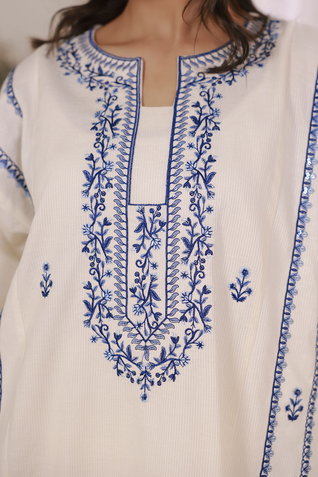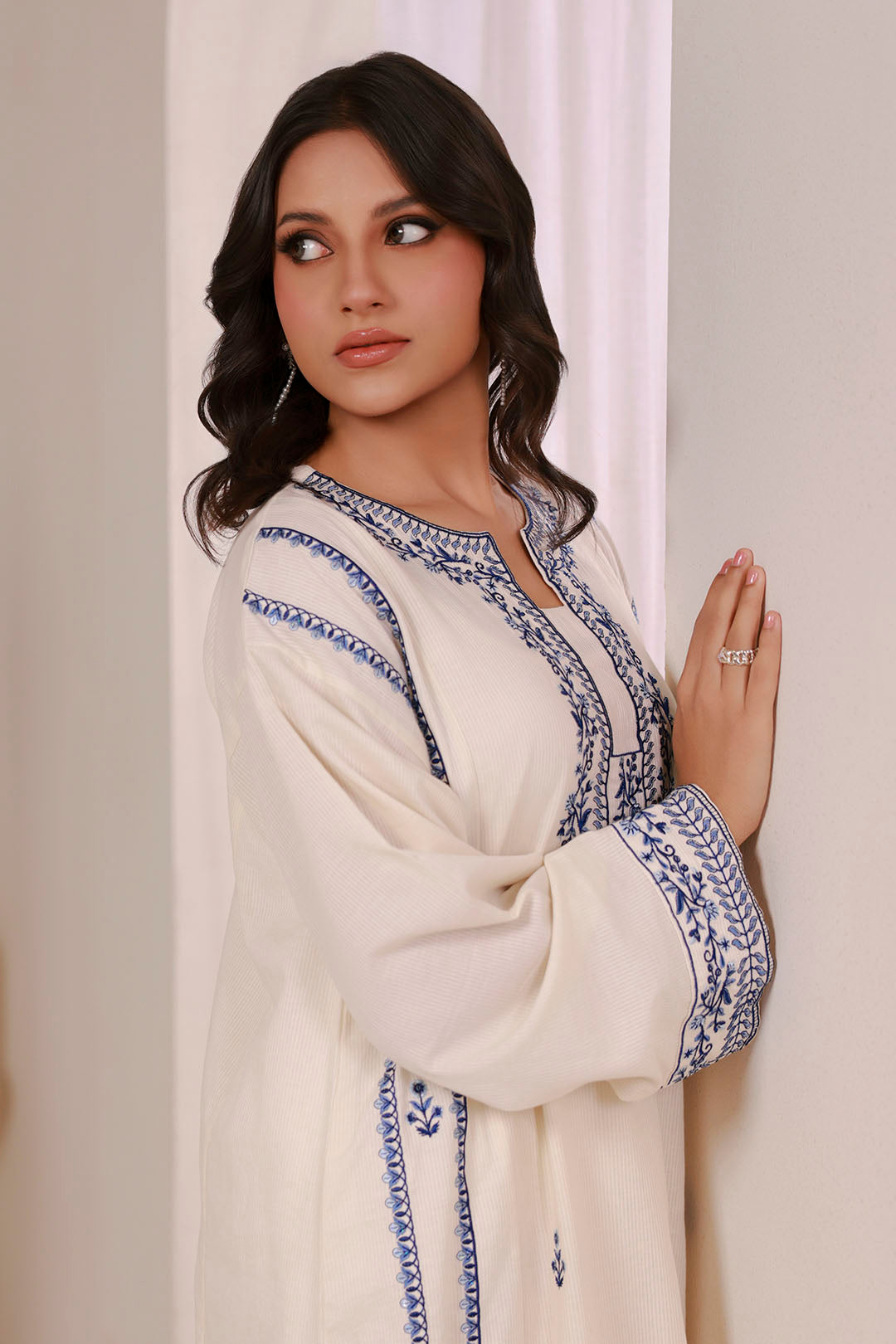Elevate your wardrobe with this sophisticated embroidered kurta trouser set, expertly crafted for the modern woman. Featuring intricate embroidery detailing on premium textured lawn fabric, this pret piece offers refined elegance with effortless comfort. The off-white palette provides versatile styling options, seamlessly transitioning from casual gatherings to formal occasions. Textured lawn ensures breathability and durability, making it an ideal choice for Pakistan's climate. A timeless investment piece that combines traditional craftsmanship with contemporary design sensibilities.