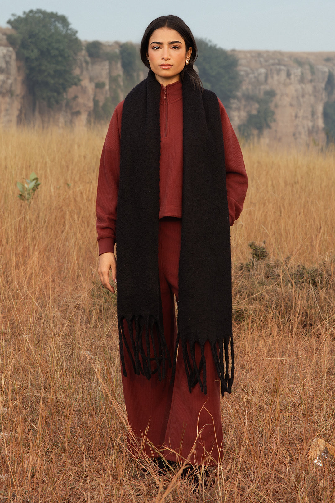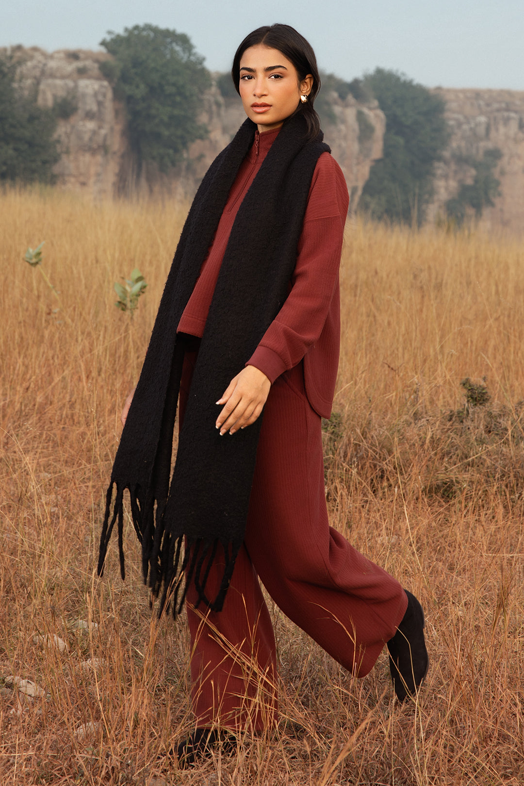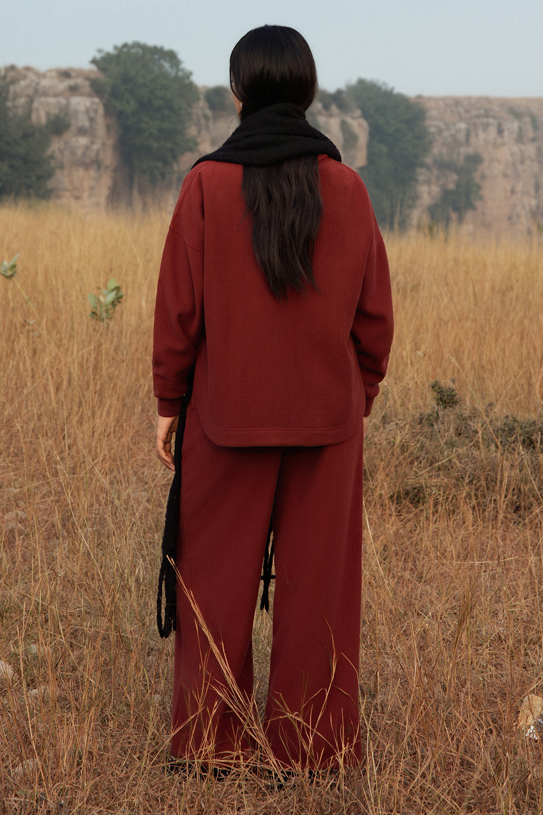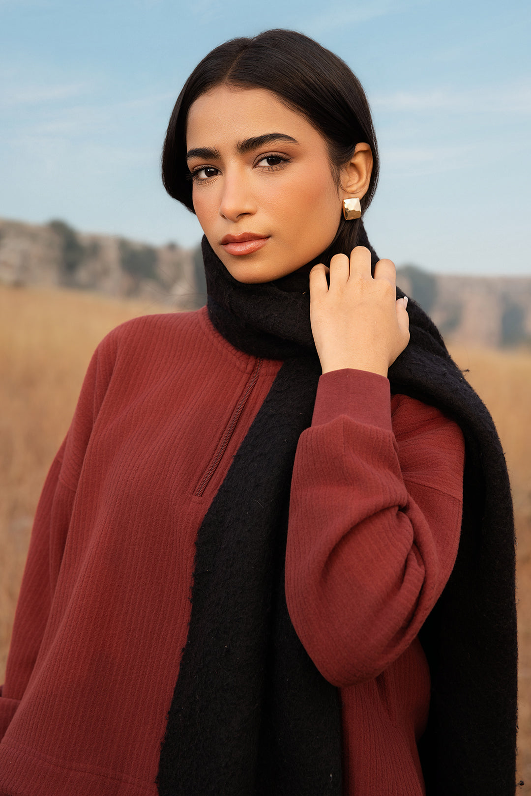 Relaxed Fit Rust half zip top in drop needle - polar fleece fabric, featuring high neck and a rounded high-low hem. Perfect for keeping you polished and warm.
