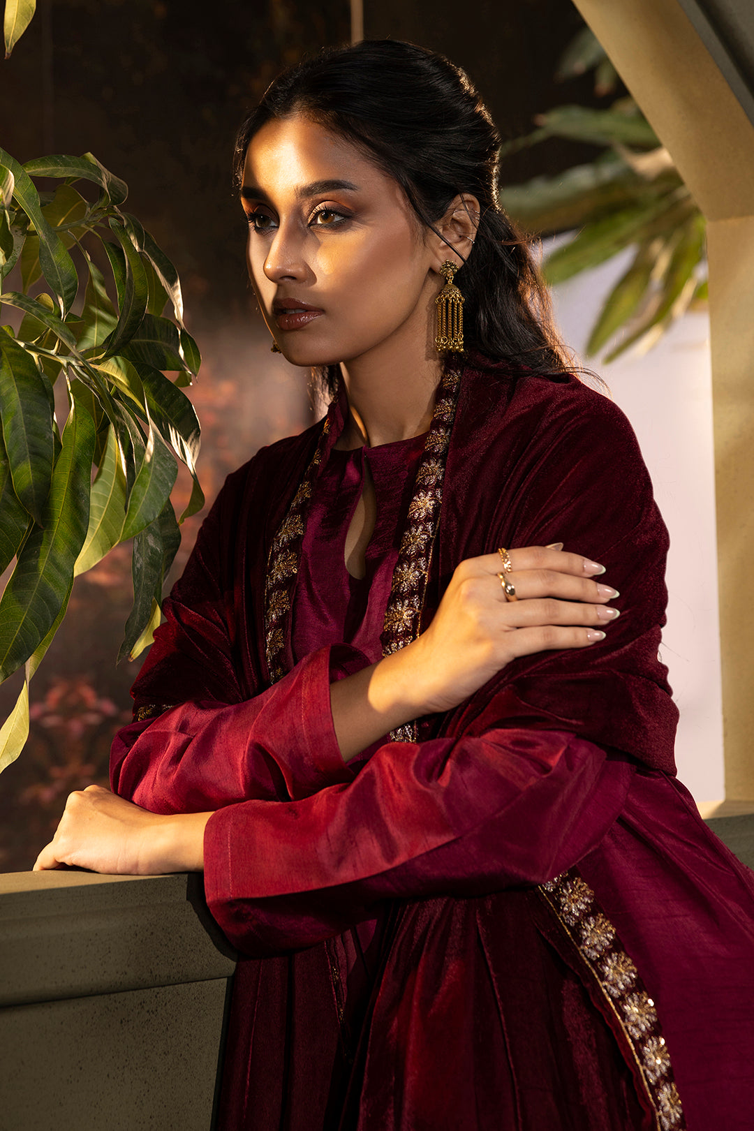Experience elegance with this maroon velvet women's shawl, designed to provide warmth and a luxurious feel. Its rich color and soft fabric make it an ideal accessory for both casual and formal occasions, ensuring comfort while enhancing your outfit's sophistication.