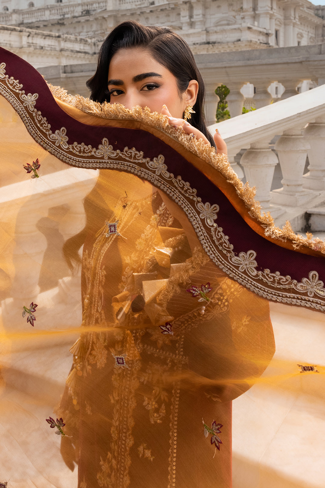 Deep maroon velvet blooms with florals embroidered in thread, sequins, and glimmering zari with Front and back separate embroidered borders to elevate the outfit. The rust orange organza dupatta floats lightly, adorned with delicate embroidery that complements the shirt’s regal richness, completed with a raw silk trouser. This outfit is an effortless blend of refinement, and feminine grace. A story of craft and couture.