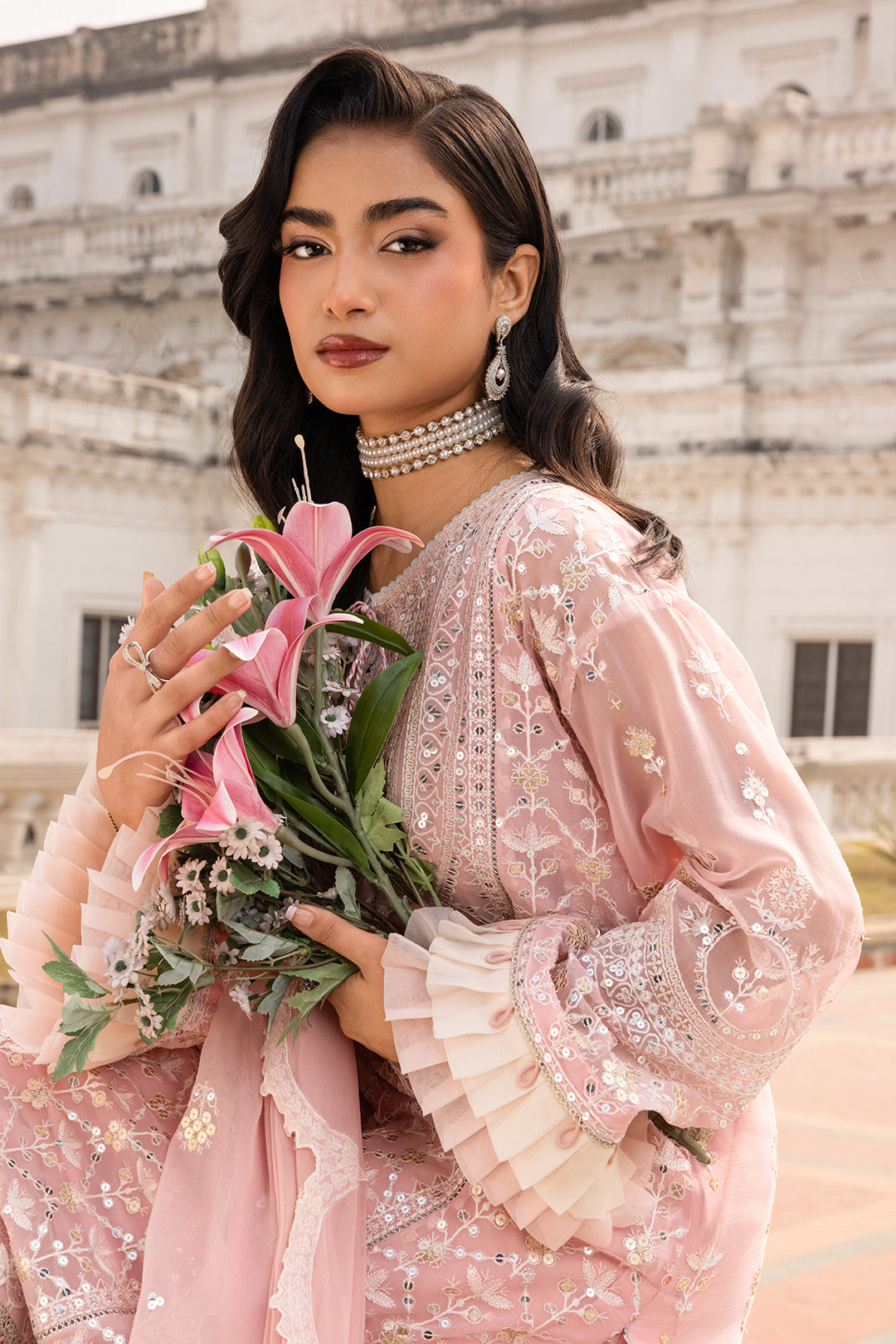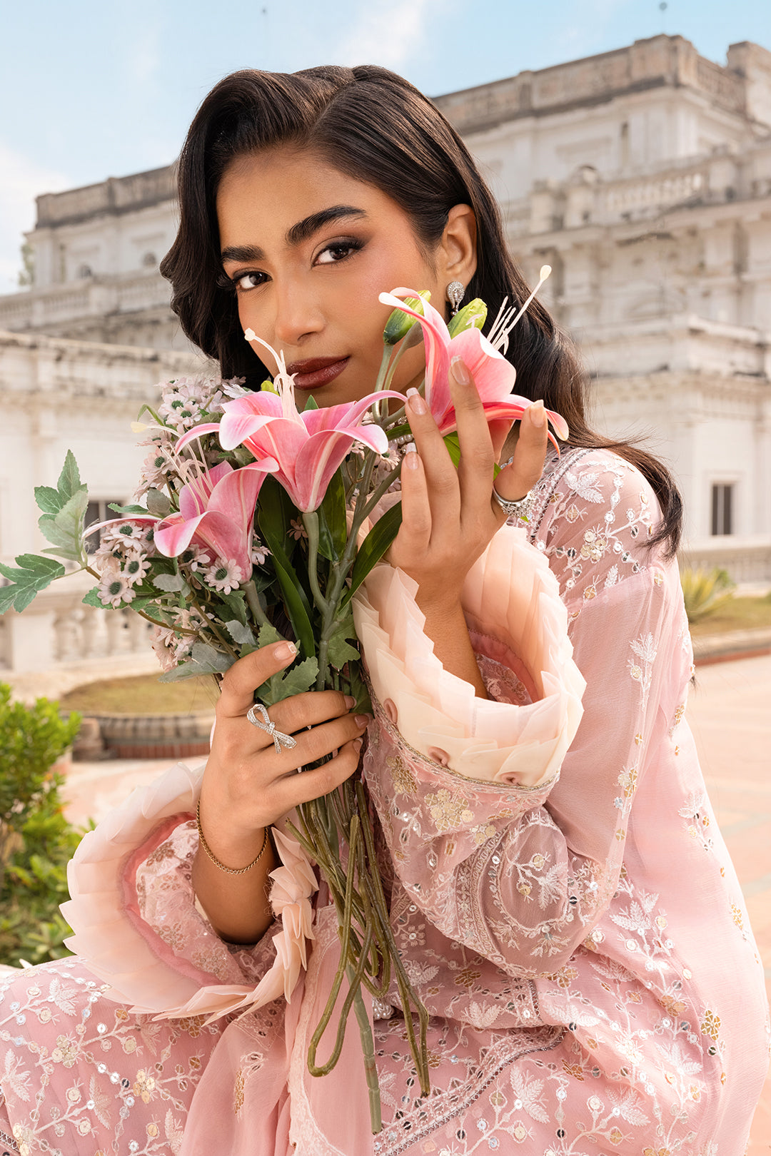 Bathed in soft baby pink chiffon, this Outfit is a vision of understated luxury - adorned with delicate sequins and zari embroidery. Front and back embroidered borders frame the silhouette with refined precision, layered over a luxurious crepe silk inner. A matching chiffon embroidered dupatta drapes with ethereal grace, complemented by a fluid crepe silk trouser. A harmonious ensemble that speaks of sophistication, femininity, and timeless elegance.