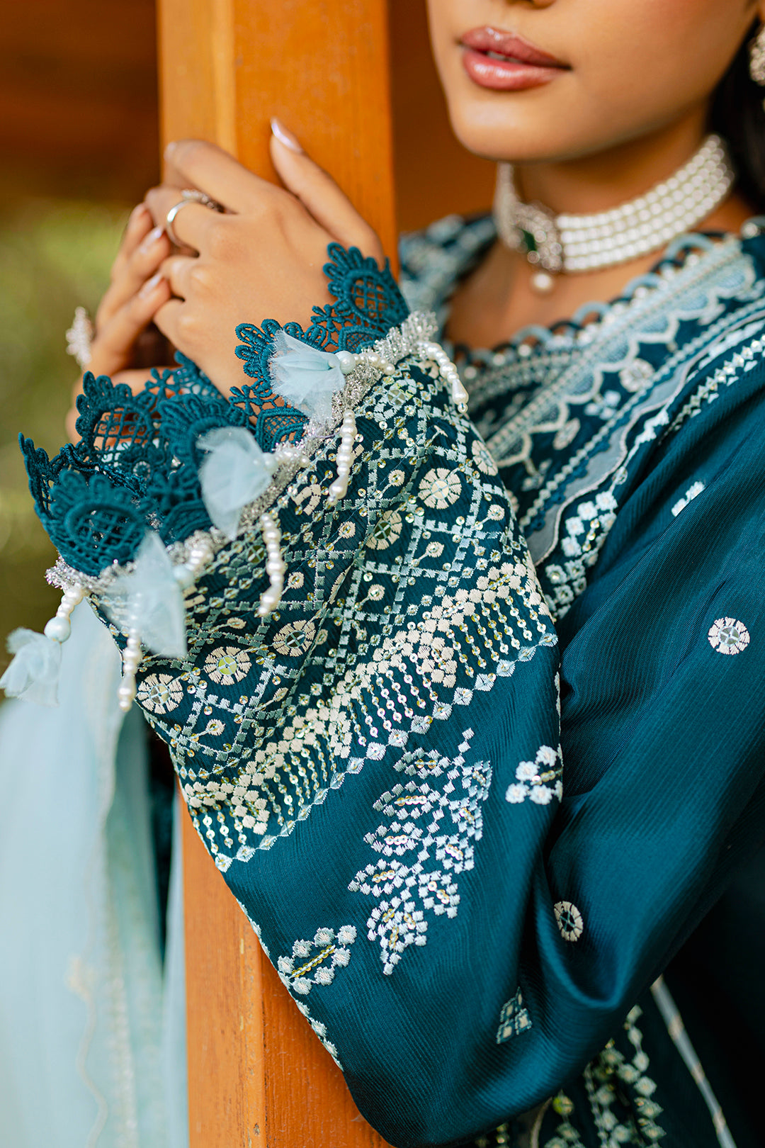 DYED EMBROIDERED RAW SILK SHIRT-DYED EMBROIDERED PAPER COTTON DUPATTA-DYED RAW SILK TROUSER