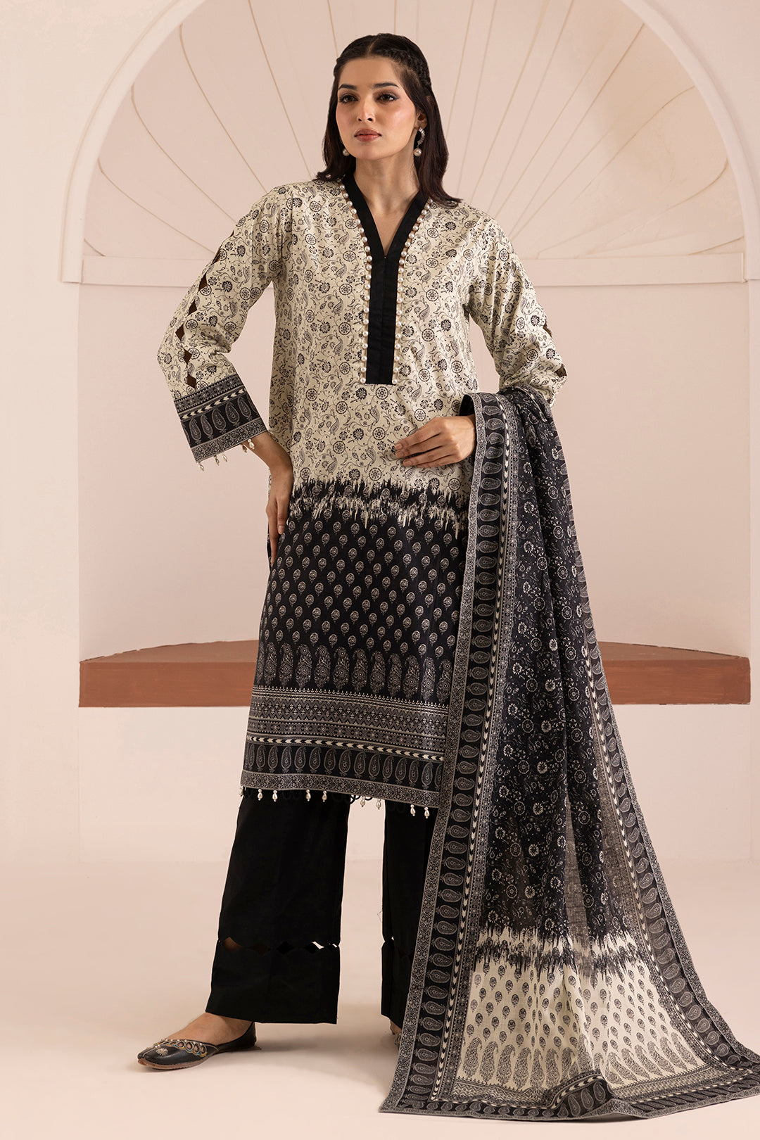 Buy 3 Piece Printed Khaddar Shirt Shalwar Dupatta in Off -White Color
