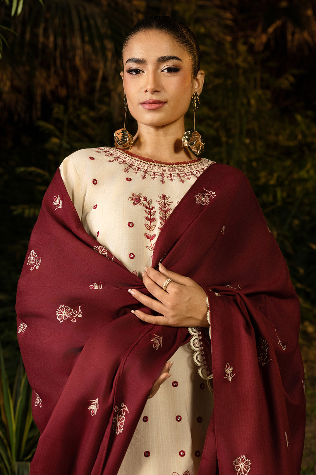 Buy 3 Piece Printed Khaddar Shirt Shalwar Shawl in Beige Color