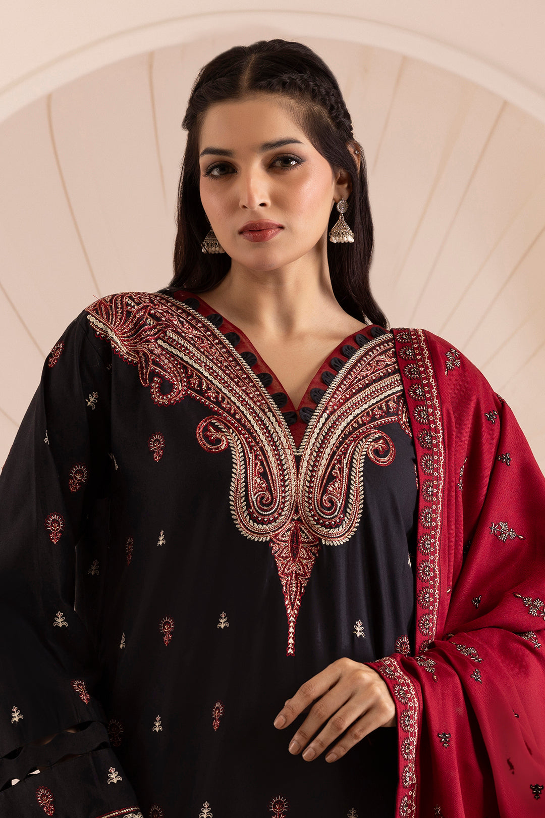 Buy 3 Piece Embroidered Cotton Satin Shirt Shalwar Shawl in Black Color