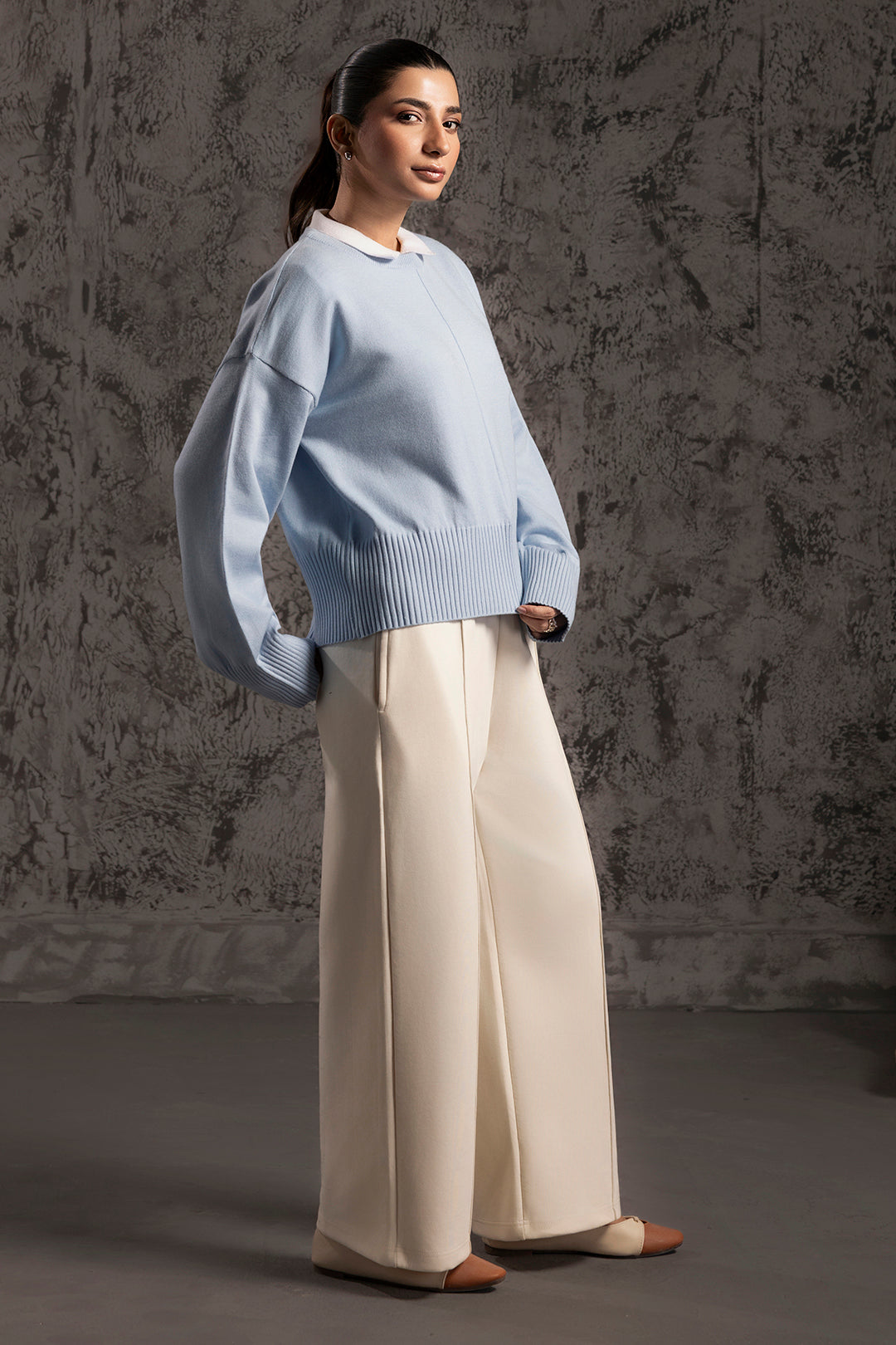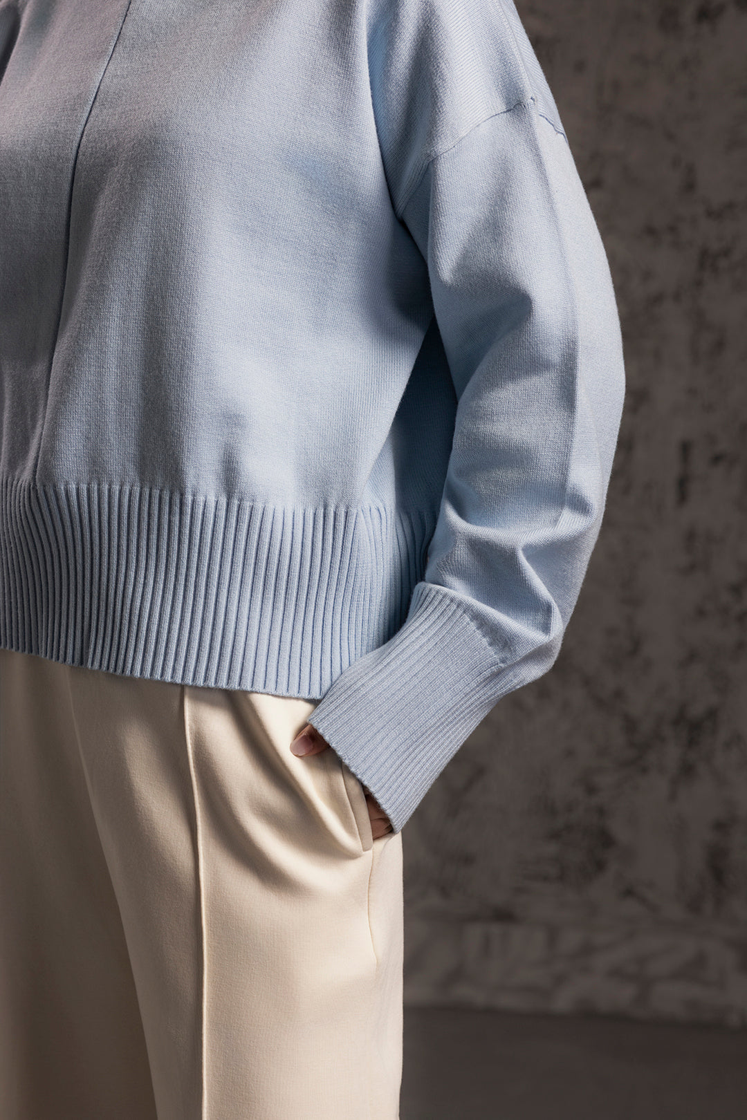 Luxuriously soft relaxed fit light blue VPN sweater. Features a refined center seam and wide textured ribbed hem and cuffs for a flattering fit. Perfect for layering or wearing solo.