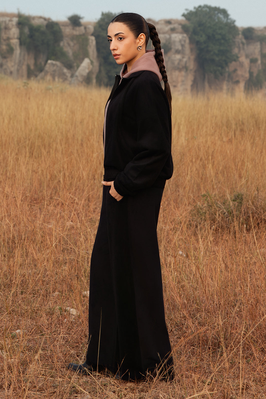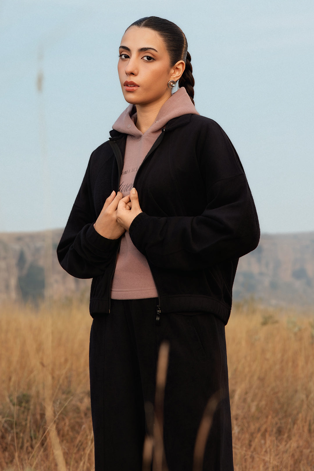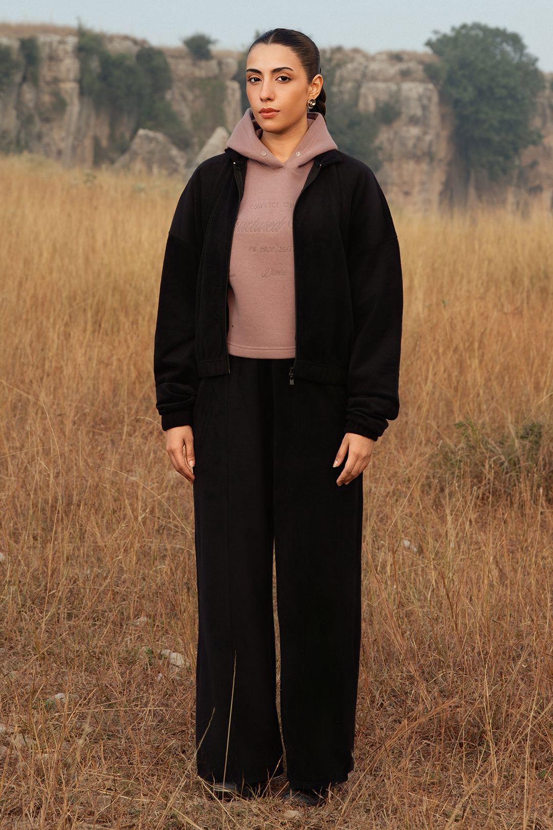 High-waisted Black tailored-fit trousers in buttery velour fabric, finished with side pockets and a front pleat for a polished yet easy-to-style look.